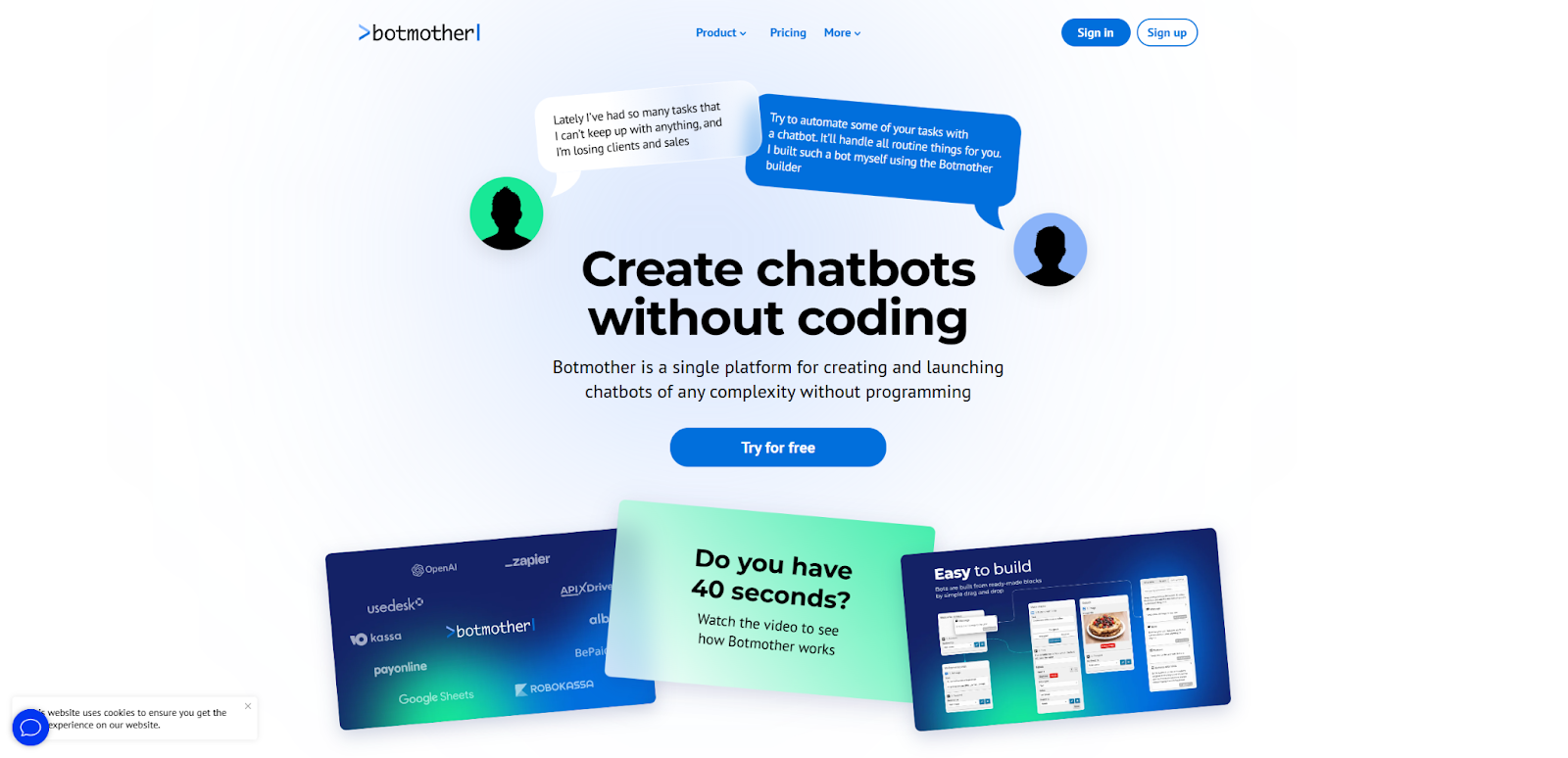 No-code платформа для создания чат-ботов с поддержкой множества мессенджеров и каналов связи с клиентами. Подходит для автоматизации продаж, лидогенерации и обработки заказов, когда нужно обработать трафик из разных источников и передать данные в CRM. Разработка чат-бота для продаж на данном сервисе потребует глубоких навыков программирования, так как no-code функционал позволяет создавать только простых помощников.
