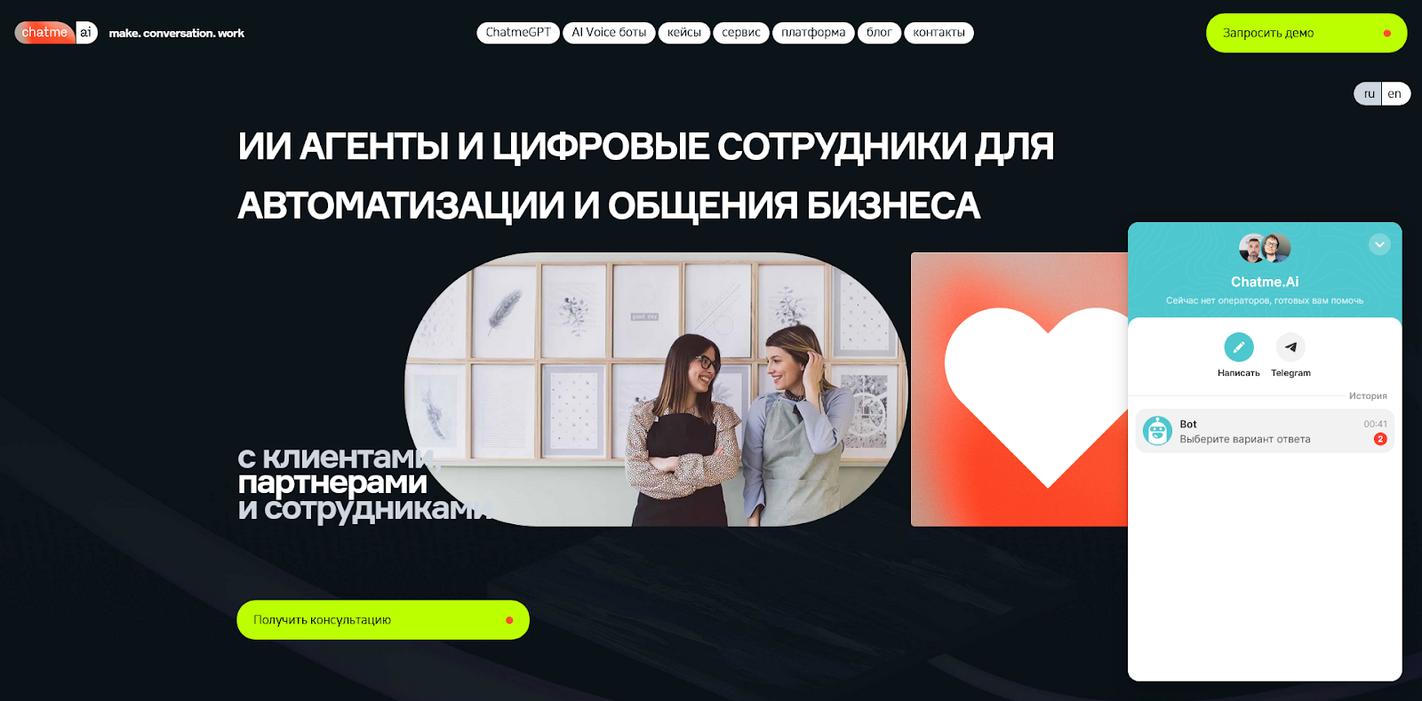 Российская компания, создающая ии-агентов и цифровых сотрудников для бизнеса. На платформе есть интуитивно понятный конструктор, позволяющий быстро создать чат-бот даже без глубоких навыков программирования. При необходимости, компания готова разработать решение для автоматизации работы чата на вашем сайте и в мессенджерах – как с использованием алгоритмов ИИ, так и без них.