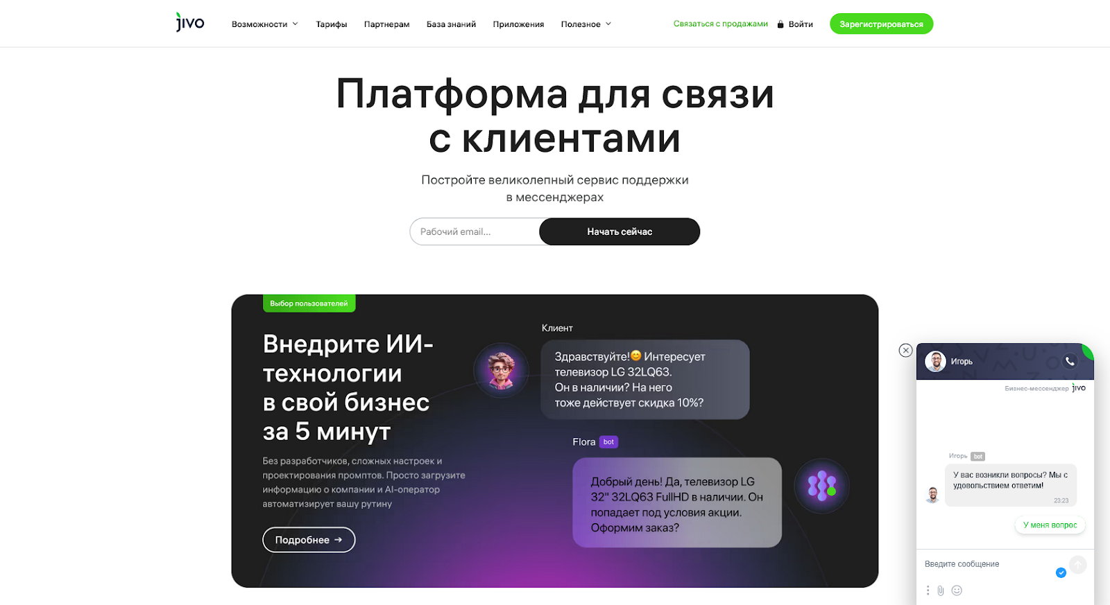 Сервис-аналог Jivo. Он позволяет общаться с пользователями через сайт, мессенджеры и электронную почту. Клиенты могут подключить на свои площадки виджеты как обычного чата с живыми операторами, так и чат-бота с ИИ, который будет обрабатывать типовые запросы пользователей.