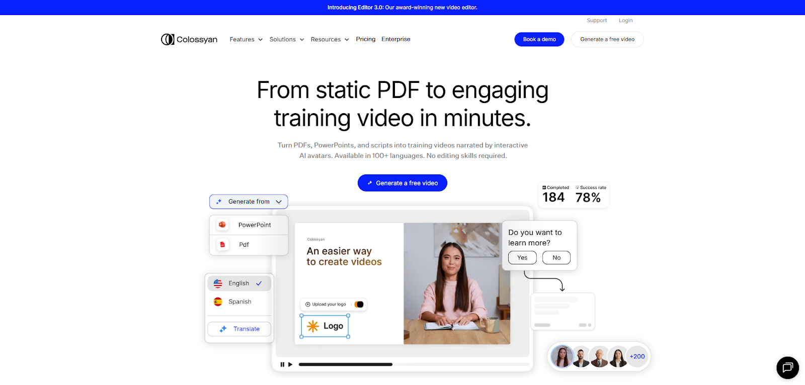 - Colossyan. Сервис для создания видео с ИИ-аватарами. Позволяет быстро создавать контент с вашим персонажем. Отлично подойдет для подготовки видеогайдов, презентаций, обучающих материалов и т.д. Есть пробный доступ. Поддерживает 80+ языков и предлагает 150+ готовых персонажей.