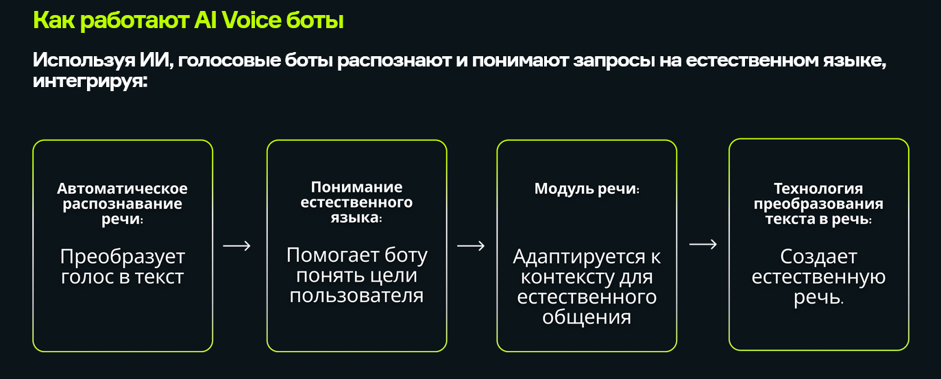 Голосовые роботы (или голосовые помощники, AI-ассистенты) — это сложное программное обеспечение, объединяющее технологии распознавания речи, ИИ-модели по интерпретации обращений, генерированию ответов и голоса. Для современного бизнеса применение подобных голосовых технологий — удобный и эффективный инструмент, который позволяет автоматизировать приём и обработку звонков, оповещение клиентов, работу сервиса поддержки и другие задачи.