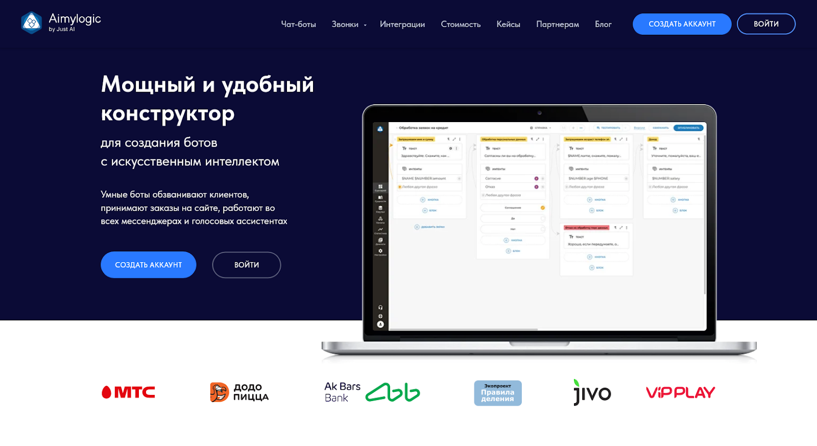 Эта платформа для создания чат-ботов, голосовых помощников и навыков для популярных AI-ассистентов позволяет автоматизировать рутинную работу операторов колл-центров. Компания предлагает виртуальных помощников с NLU-ядром собственной разработки с машинным обучением для обработки естественного языка.