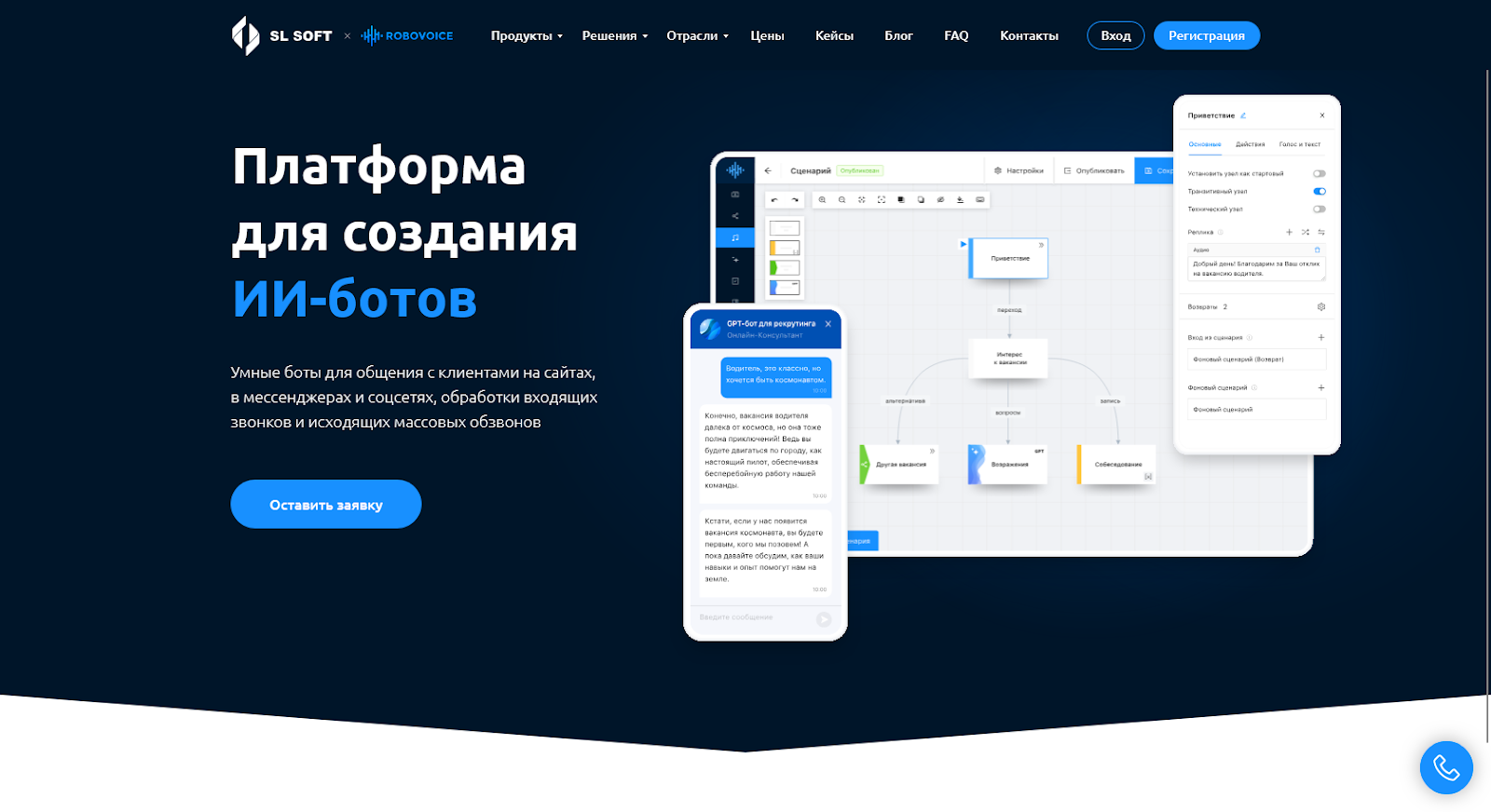 Конструктор для создания ИИ-ботов, которые будут общаться с клиентами на сайтах, в мессенджерах и социальных сетях, обрабатывать входящие звонки и проводить обзвоны пользователей.