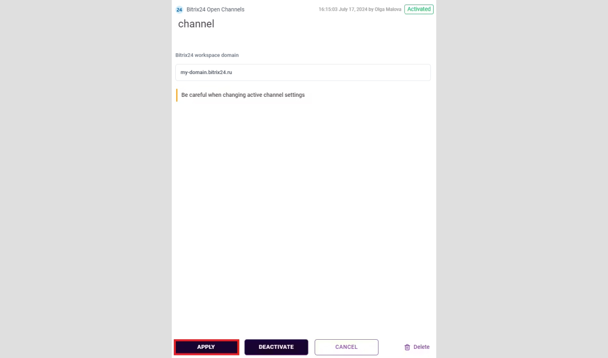 - Чтобы применить изменения к активированному Каналу Проекта, нажмите кнопку APPLY