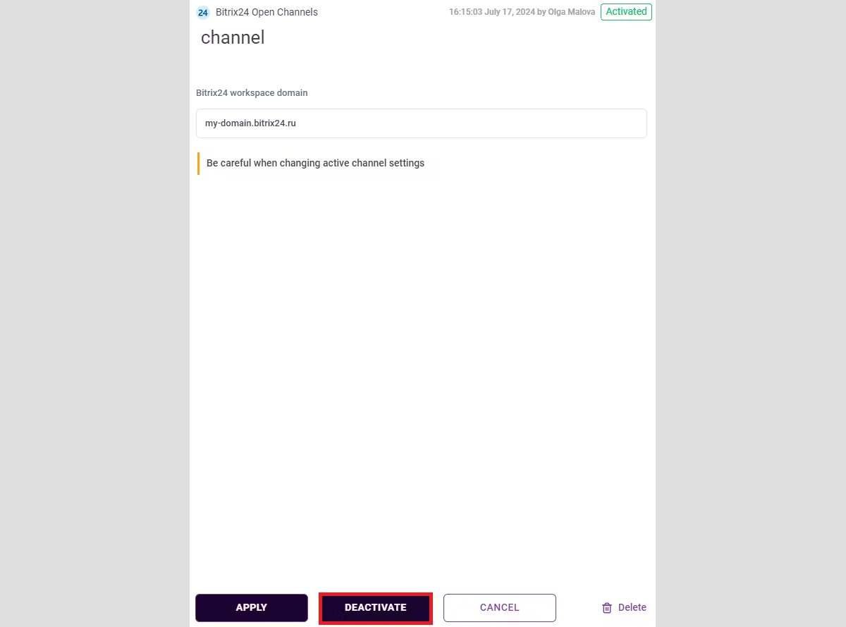 - Чтобы деактивировать Канал Проекта, нажмите кнопку DEACTIVATE