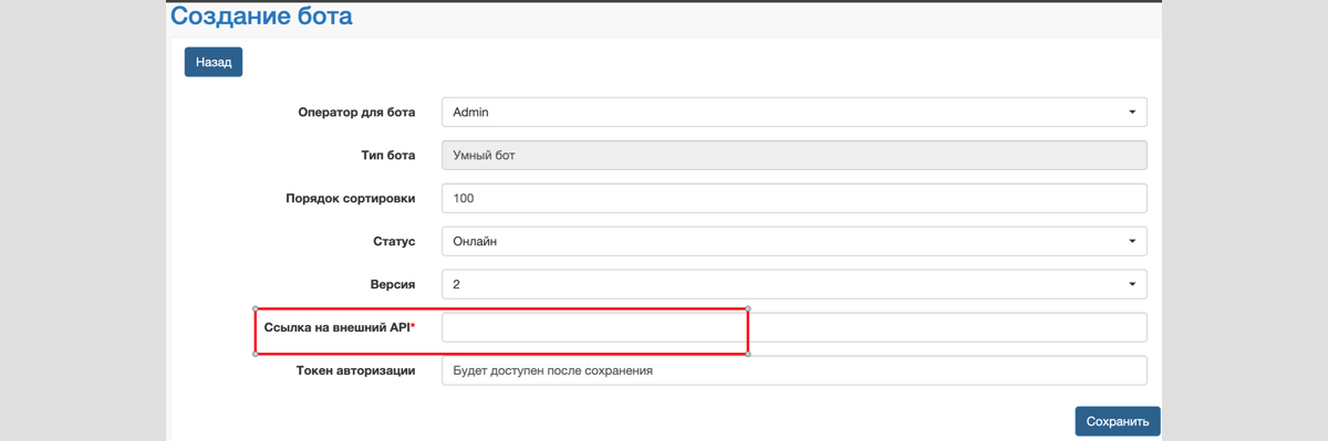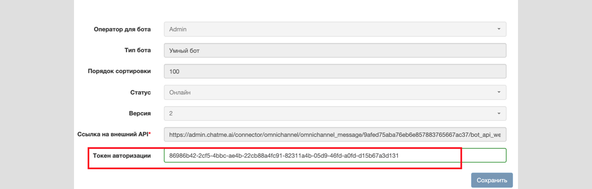 Установите ссылку на вебхук, полученную при конфигурации канала агента в Платформе, в поле Ссылка на внешний API, сохраните бота и получите токен авторизации. Используйте этот токен для завершения конфигурации канала агента.