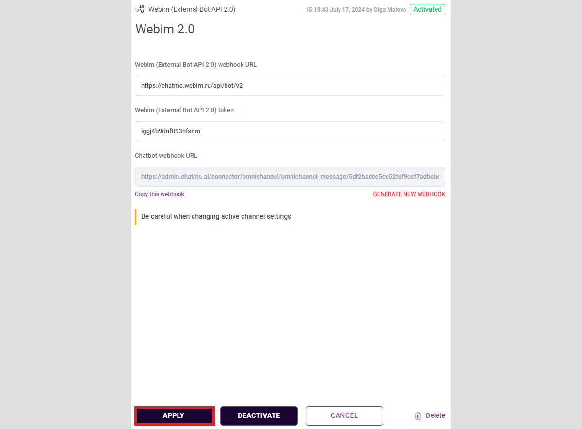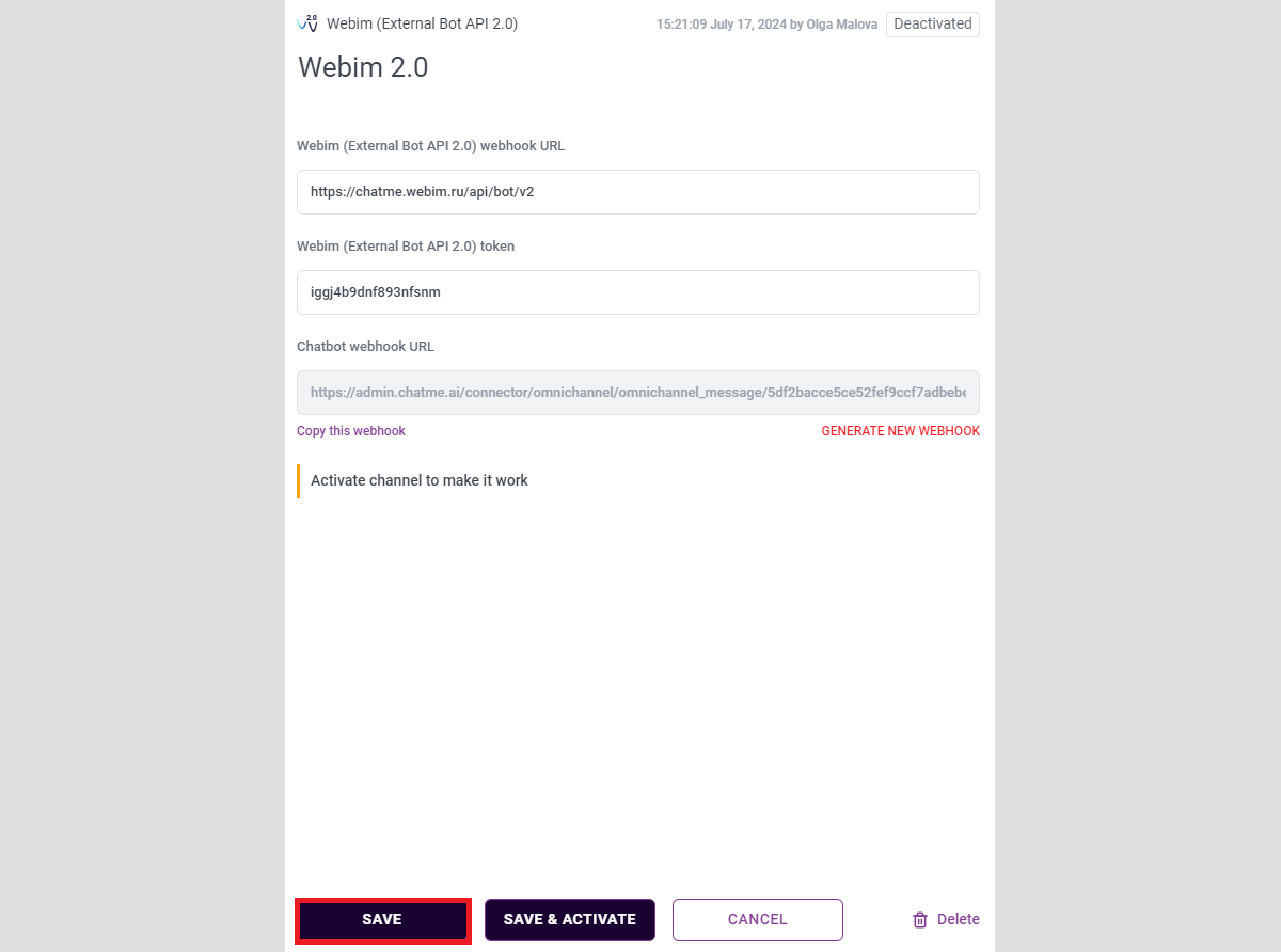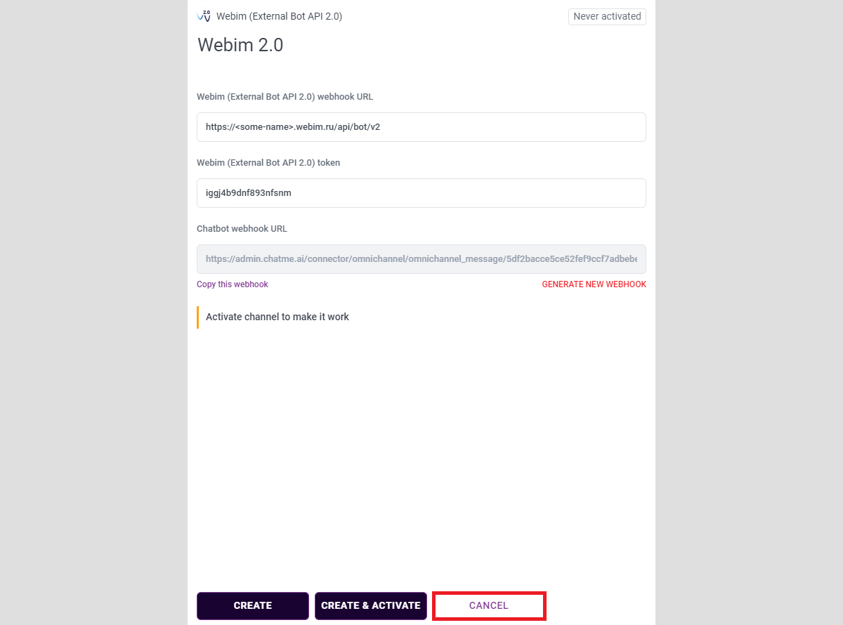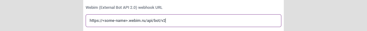 Пропишите адрес Webim External Bot API 2.0 для вашего аккаунта в поле Webim (External Bot API 2.0) webhook URL в виде: