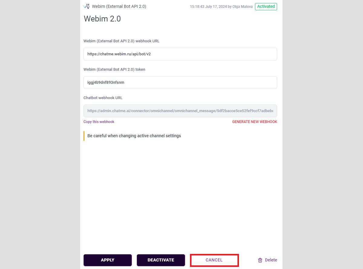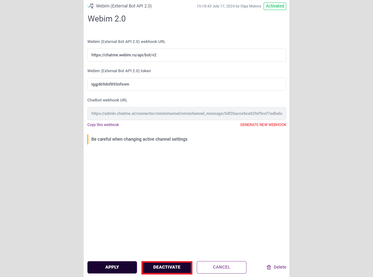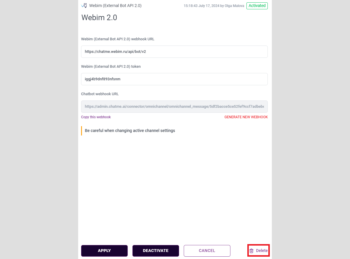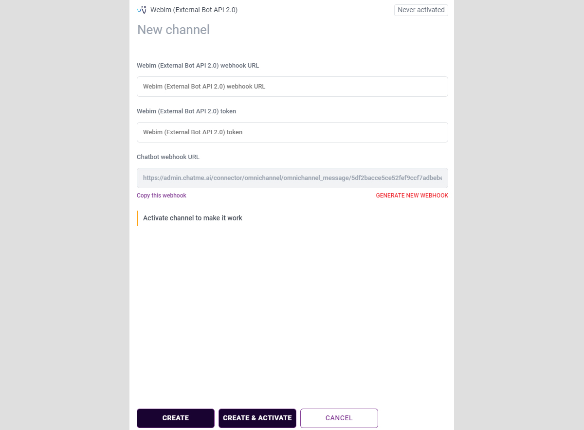Пропишите адрес Webim External Bot API 2.0 для вашего аккаунта в поле Webim (External Bot API 2.0) webhook URL в виде: