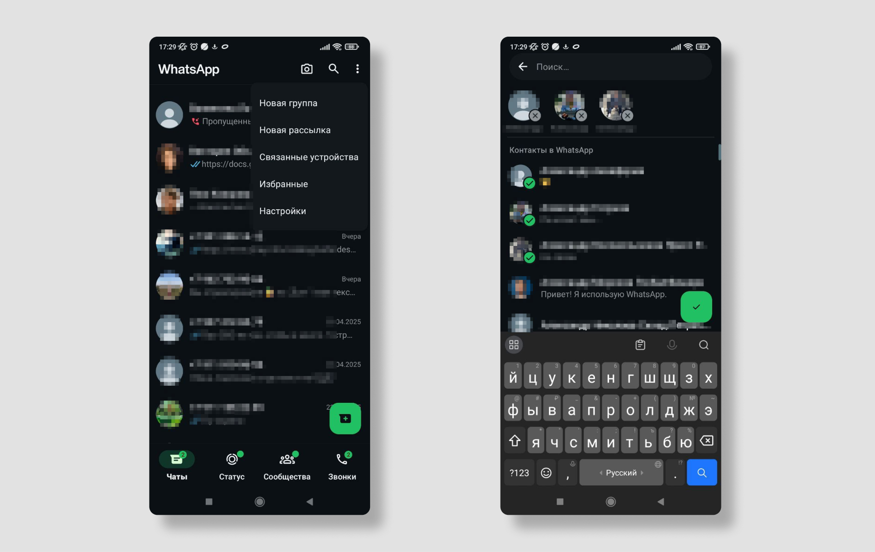 Запуск рассылки вручную прост. Скачайте и запустите приложение WhatsApp или WhatsApp Business. В правом верхнем углу экрана нажмите на три вертикальных точки и выберите пункт «Новая рассылка». Далее:
